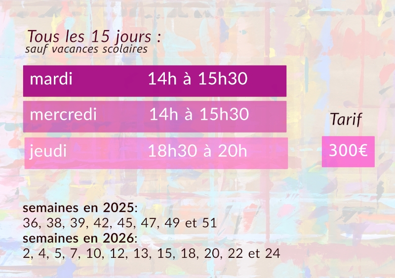 Pour préciser les objectifs de l’atelier le « Laetitia-Temps de Peindre », un entretien préalable est possible et évite ainsi tout malentendu quant au caractère singulier des ateliers que je propose.